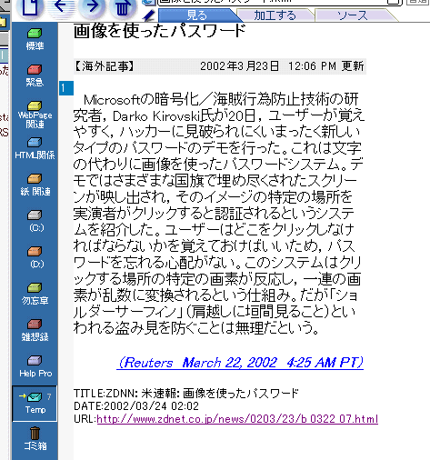 また、調べ物の最中に、目的の情報とは関係ないけど、前から少し気になっていた事の答えらしきものを見つける事もよくあります。時間があるときはゆっくり見る事が出来ますが、仕事中などではどうしても後回しになってしまいますよね。けれども、いつしかすっかり忘れてしまったり、いざ見ようとしても、ページが更新されて見れなくなってしまったというのもよくあります。